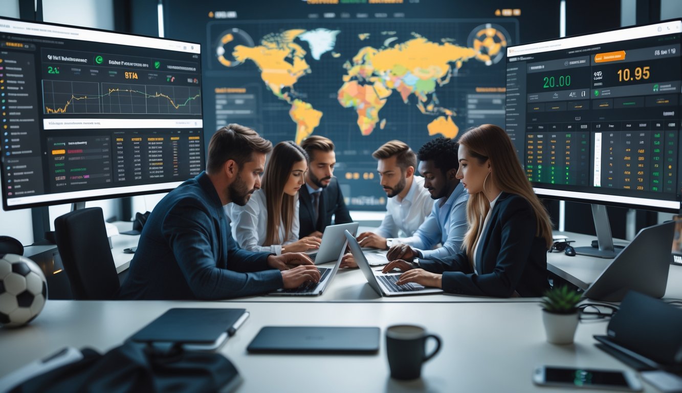 Beberapa orang sedang bekerja di kantor dengan komputer dan ponsel menampilkan statistik dan skor pertandingan sepak bola.