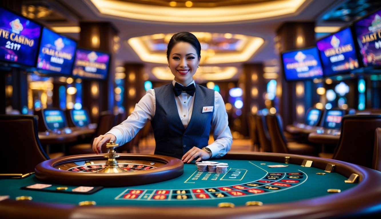 Seorang dealer kasino langsung sedang menangani kartu di meja permainan dengan latar belakang interior kasino yang mewah dan pencahayaan hangat.
