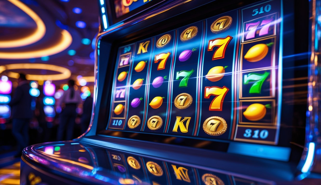 Mesin slot digital modern dengan gulungan simbol berwarna cerah di lingkungan kasino yang ramai.