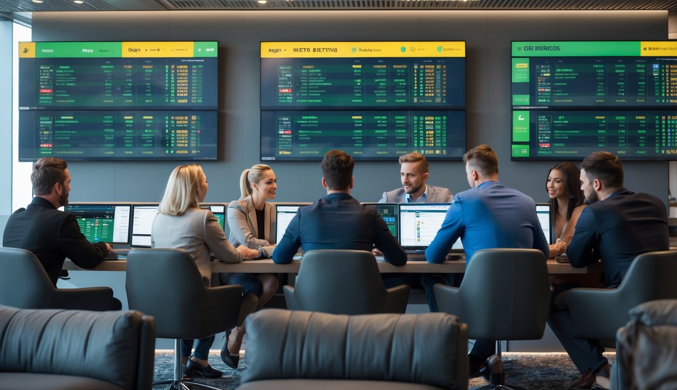 Orang-orang sedang melihat layar besar dengan statistik dan pilihan taruhan sepak bola dalam ruangan modern.